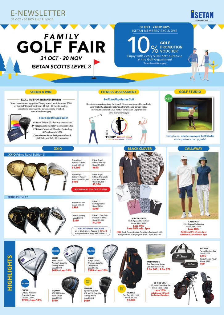 Home > E-Newsletter E-Newsletters 14/11 – 20/11/2025 Christmas Gifts for Him & Her 31/10 – 20/11/2025 Family Golf Fair 10/10 – 30/10/2025 Only at Isetan 03/10 – 30/10/2025 Tampines Moving Out Sale 26/09 – 09/10/2025 Baby Fair 23/09 – 05/10/2025 Tsukimi Matsuri